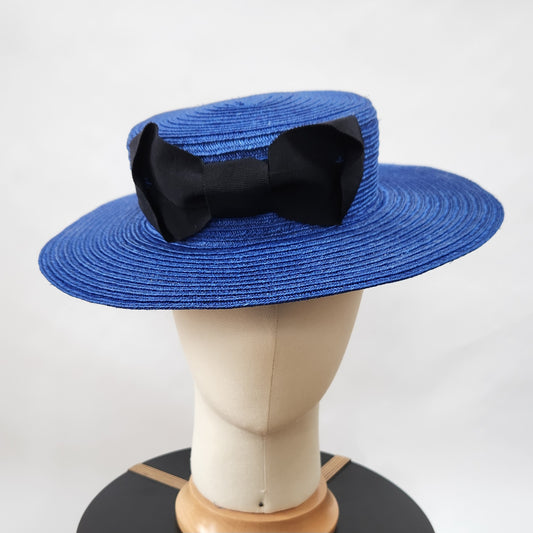 Colette Boater Hat in Blue Stitched Braid with black petersham infinity bow