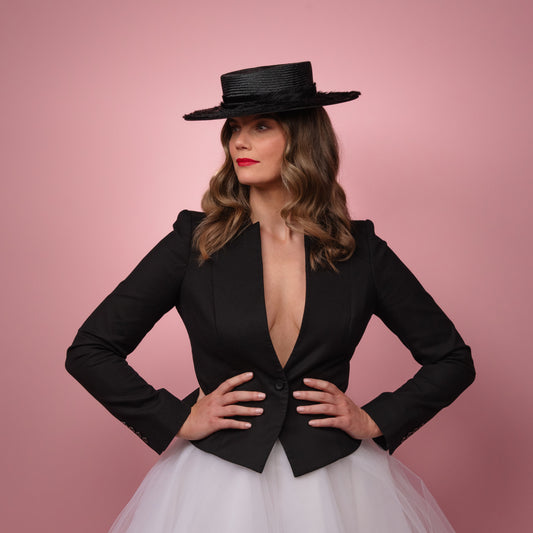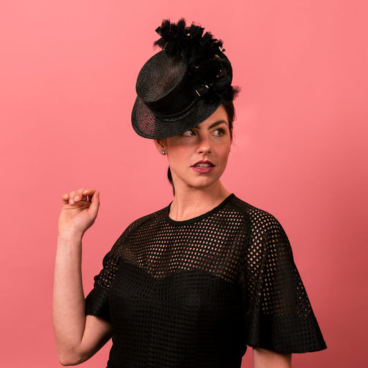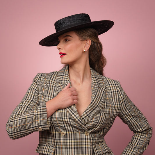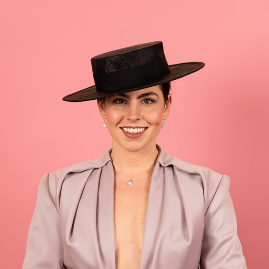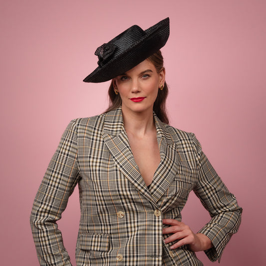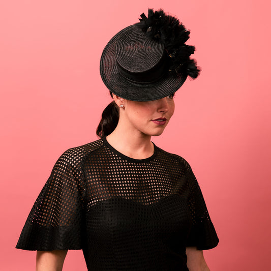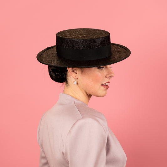 Alexandra Boater in Black Straw with Textured Brim Spring Racewear Headpiece