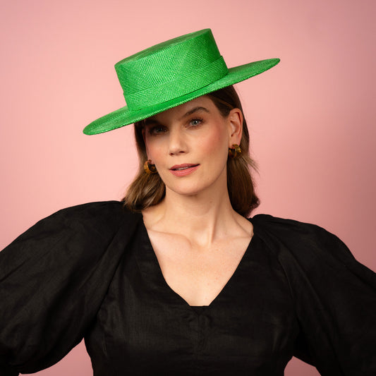 Alexia Boater with square crown and flat brim in green straw Spring Racing Hat