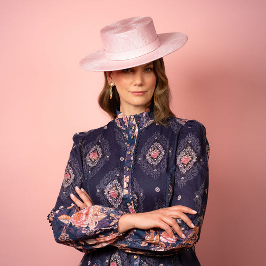 Alexia Boater with square crown and flat brim in pale pink straw Spring Racing Hat