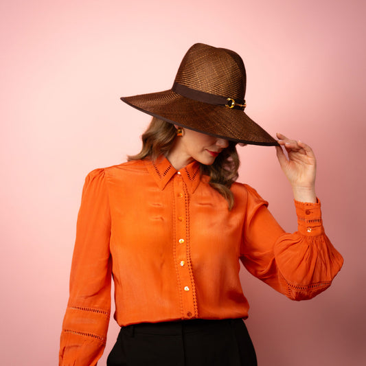Charlotte wide Brimmed hat with shaped crown in chocolate brown straw and gold buckle brim Spring Racewear Hat