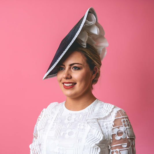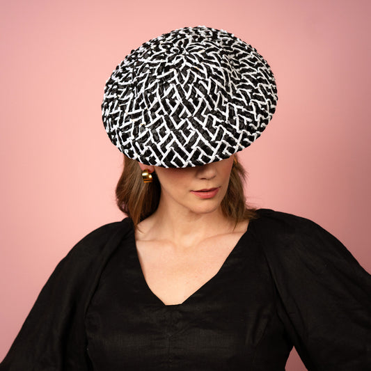 Fleur soft shaped brimmed hat in black and white straw Spring Racing Headpiece