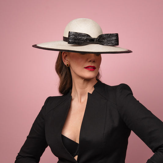 Thea Style Wide Brim hat in Ivory with Black rope trim Spring Racewear Headpiece Spring Racewear Hat