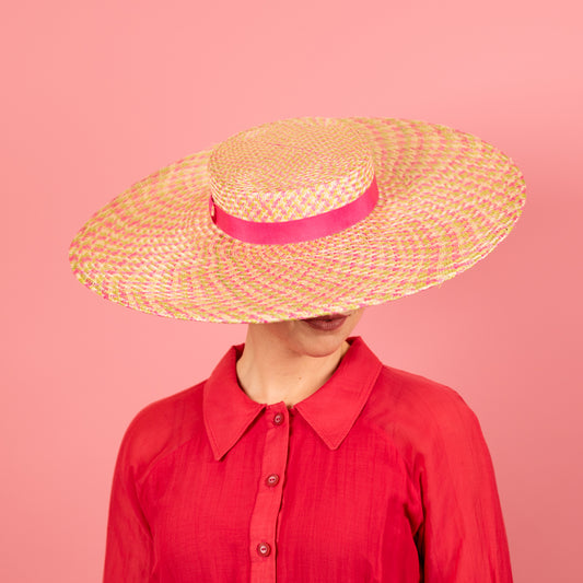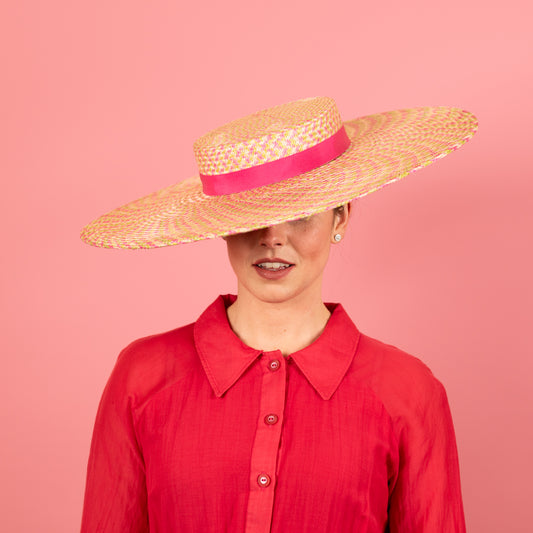Alex Boater in Multicoloured Green, Pink and Ivory with Pink Petersham band