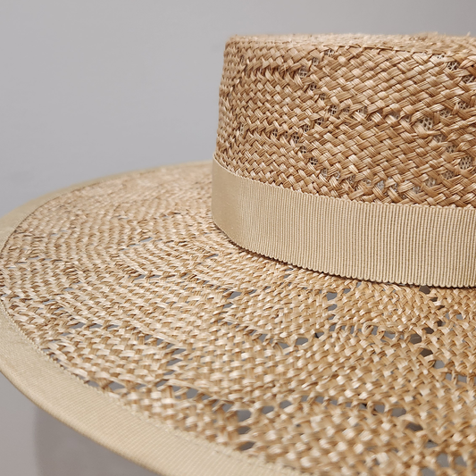 Alexandra Boater Wide Brimmed Boater Hat in Cream Hexagon Straw with Petersham Ribbon Band Spring Racewear Hat