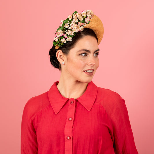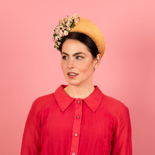 Emma straw halo with vintage flowers in pink Spring Racewear Headpiece