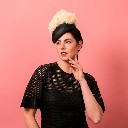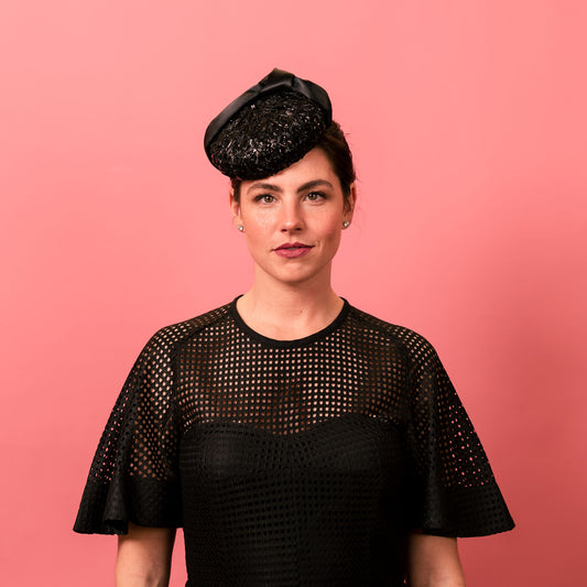 Cresta front of the head mini pillbox in black with a knot trim Spring Racewear Headpiece