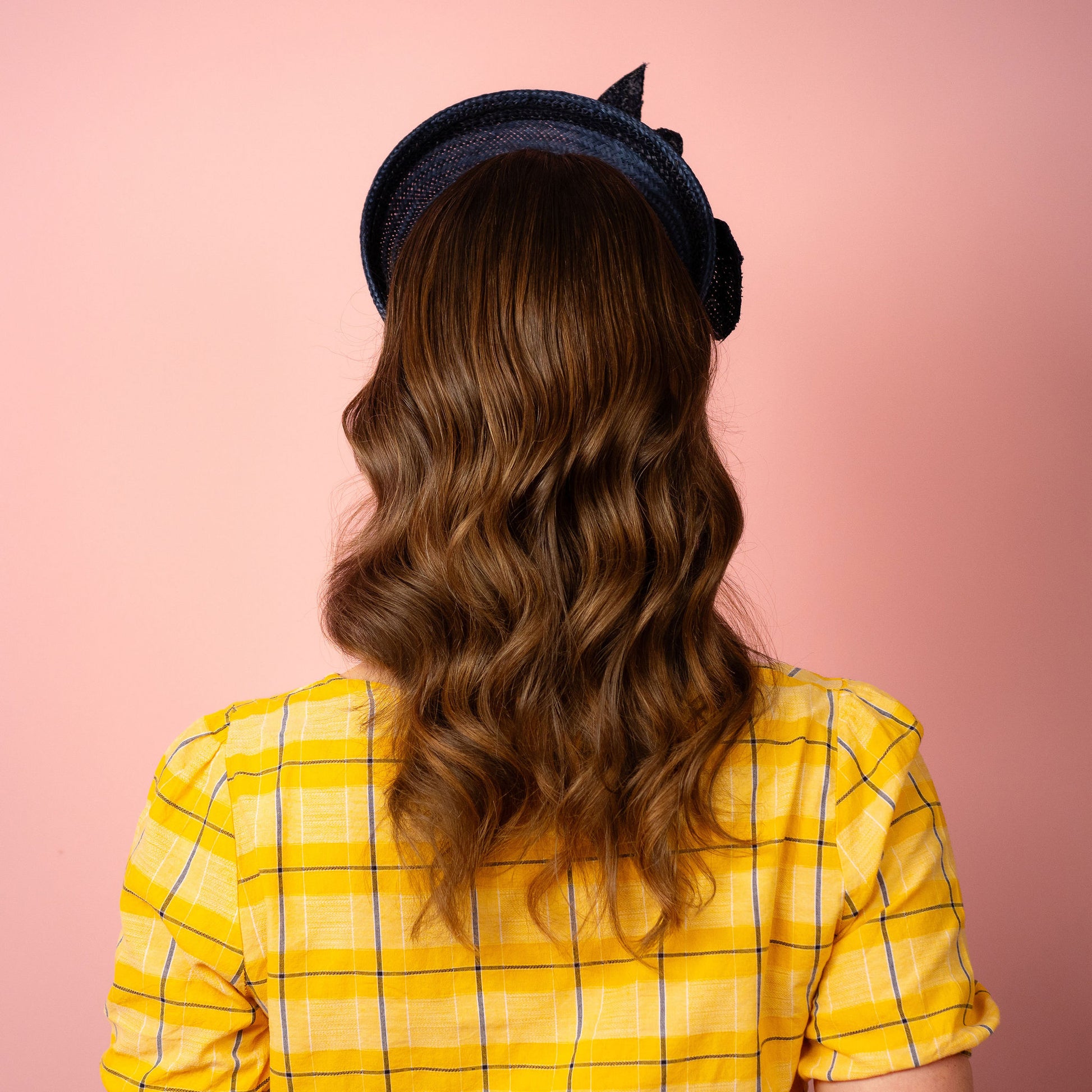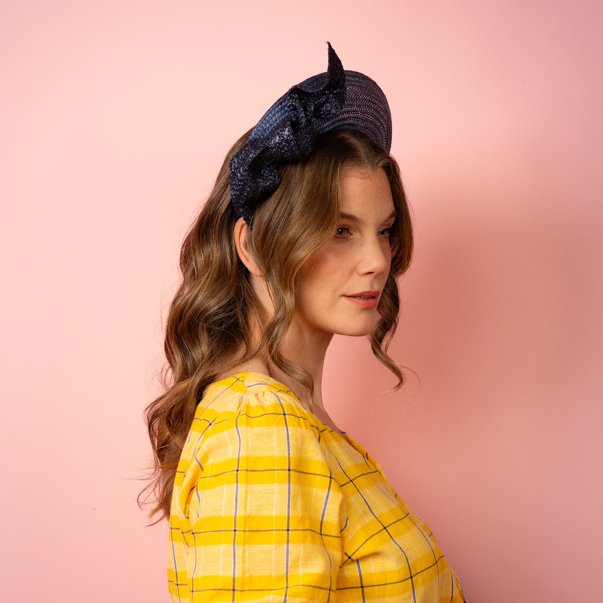 Amelia is a straw halo with knotted straw braid trim in navy. It is designed to be worn centrally on the head and secured with an elastic and a comb.