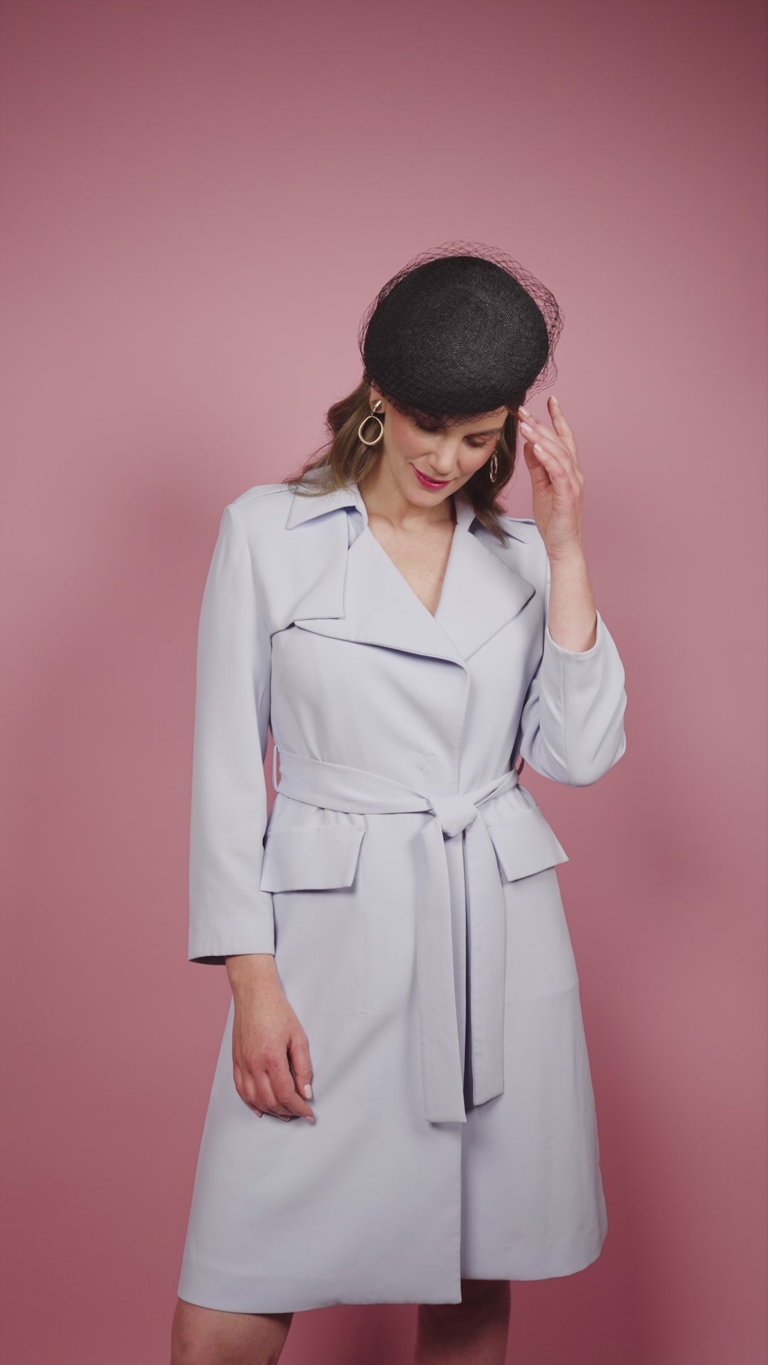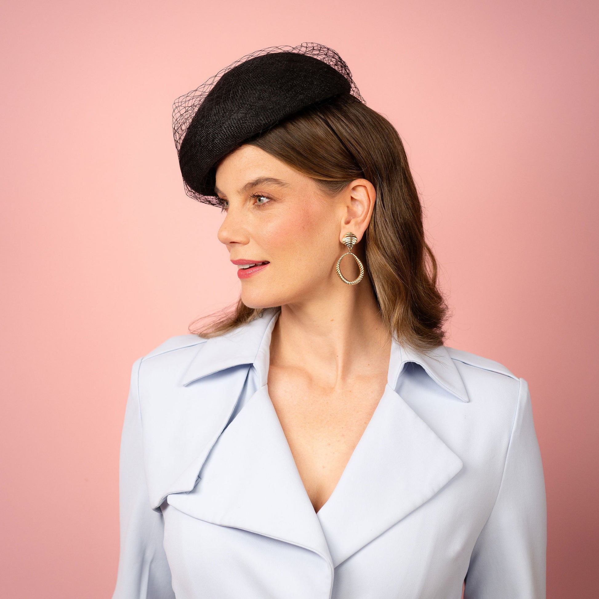 Clementine is a soft sloped straw beret with draped veiling in black. This style is one size fits all and is secured with a shaped wire headband, elastic, and a comb, offering a comfortable and secure fit for all-day wear.