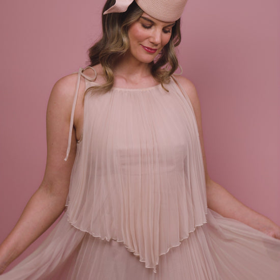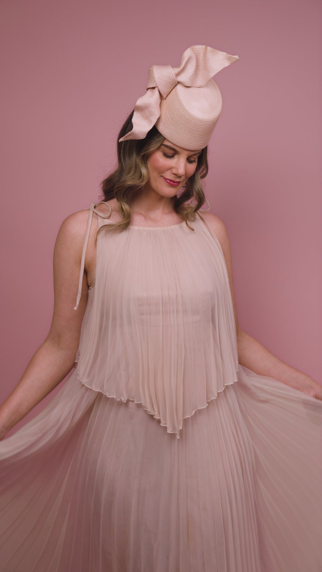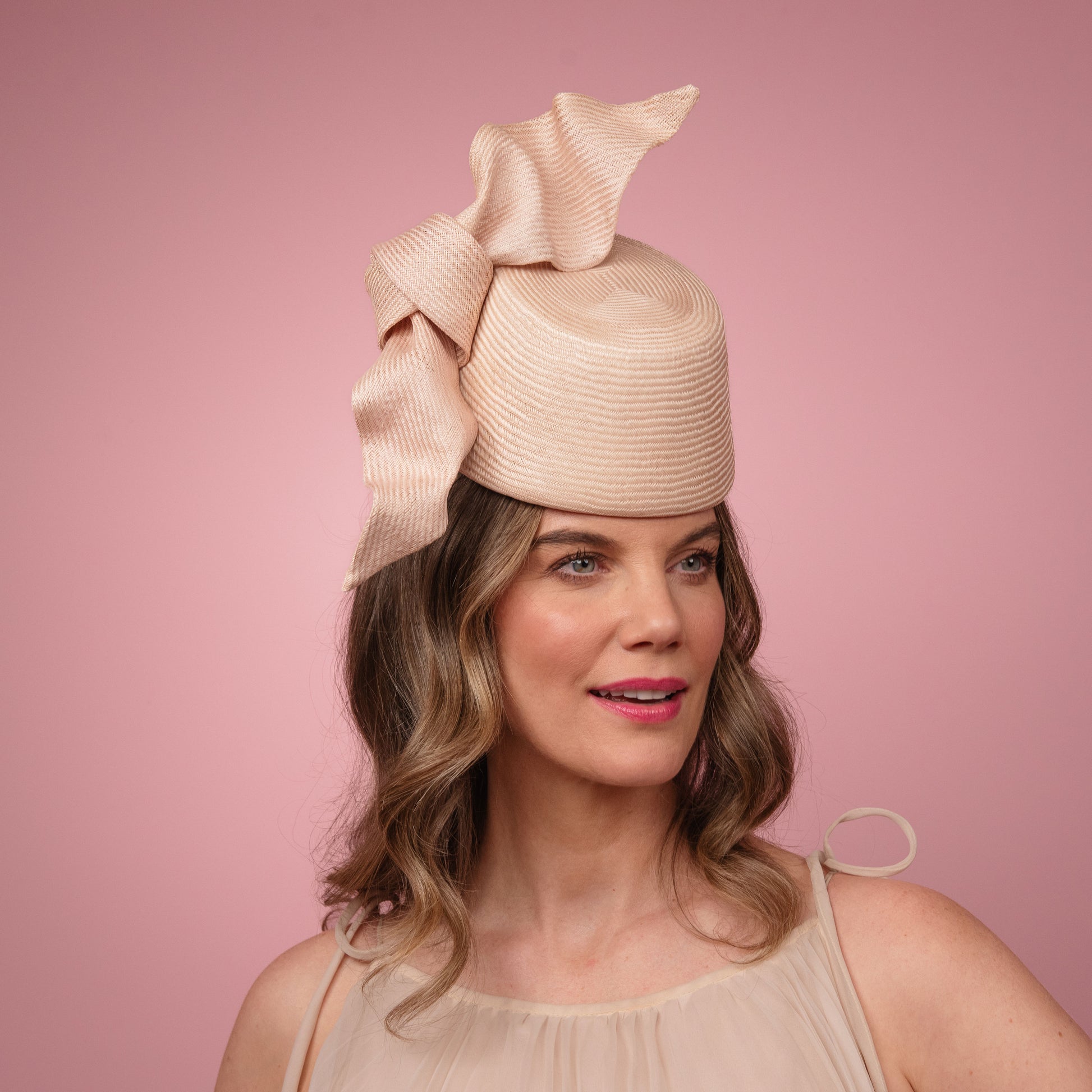 Cristina front of the head pillbox in pale pink with a knot trim Spring Racewear Headpiece