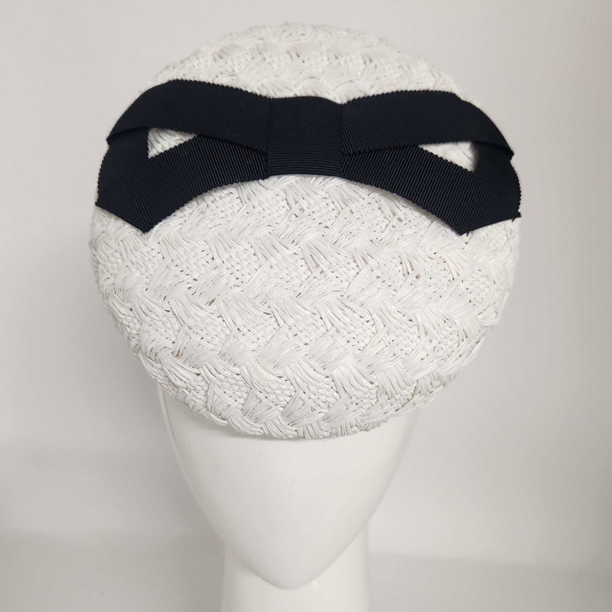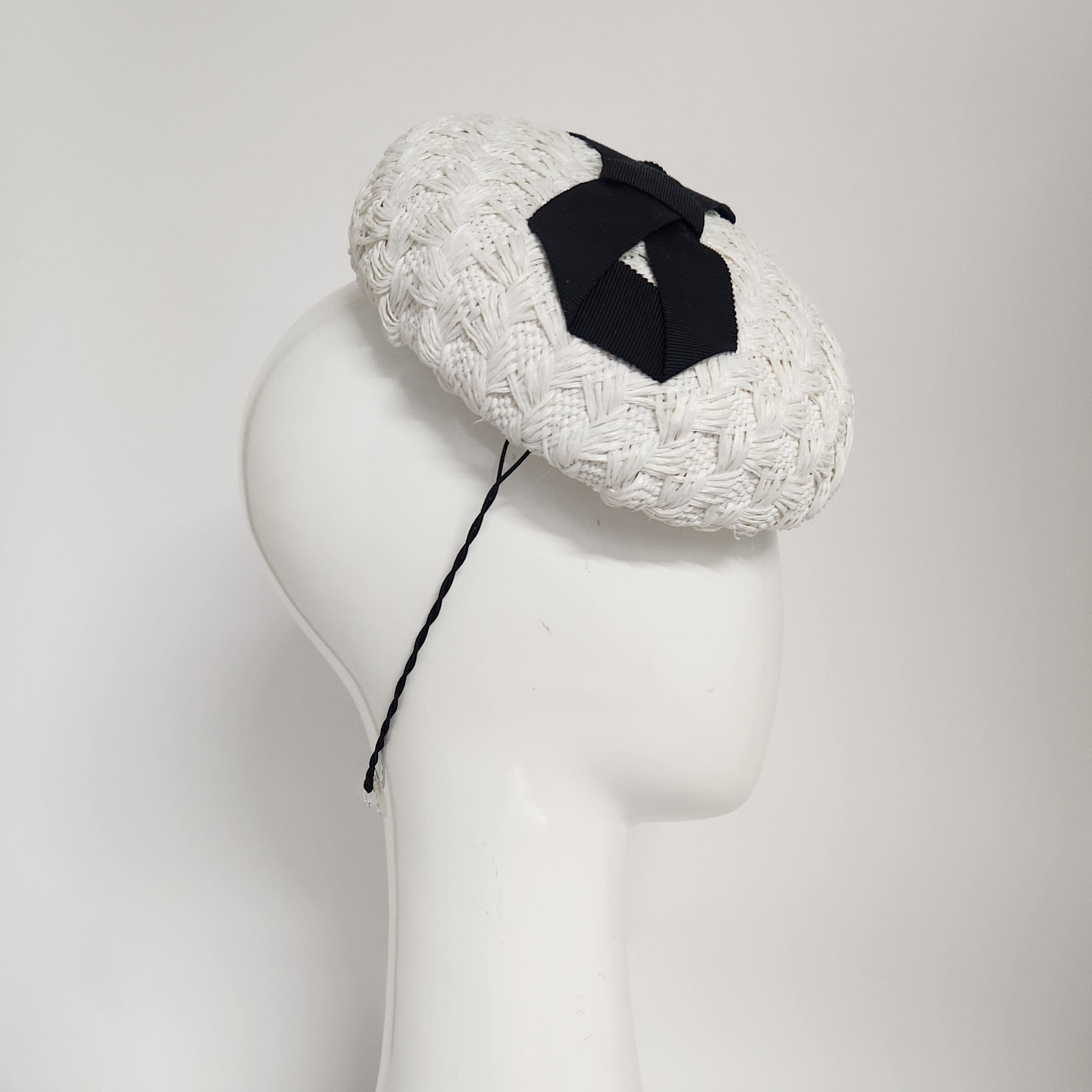 Eva Beret in white vintage straw with black infinity petersham bow. This piece is secured with an elastic and comb.