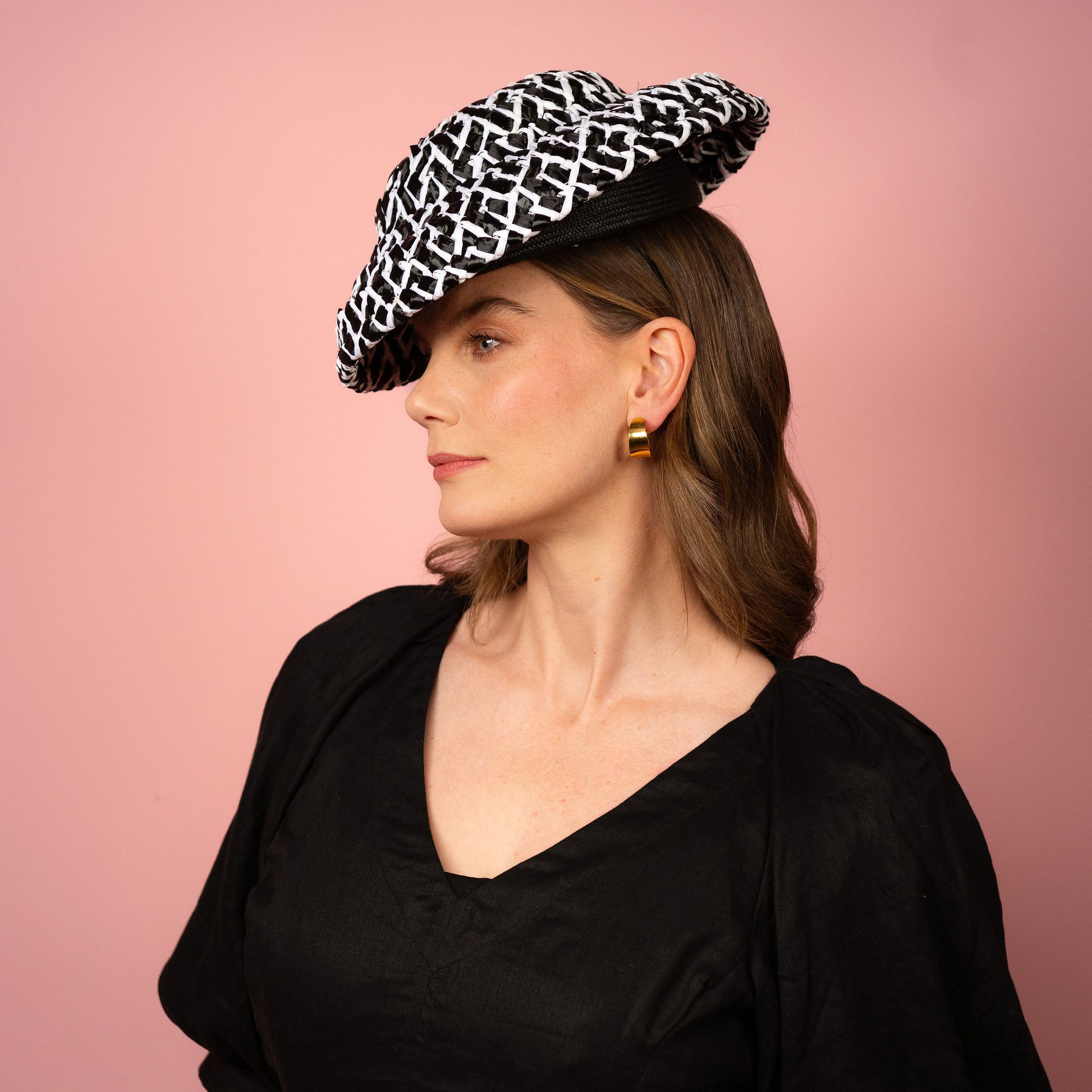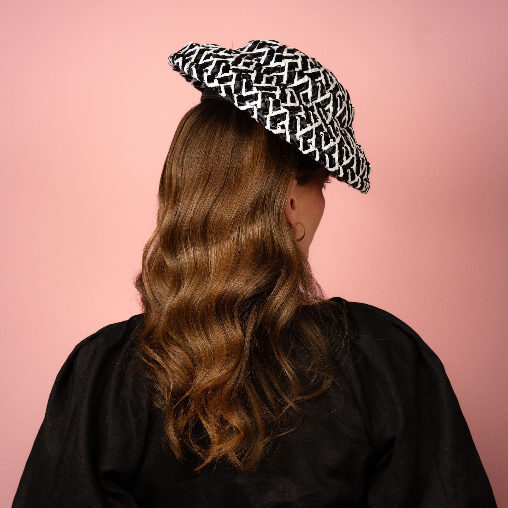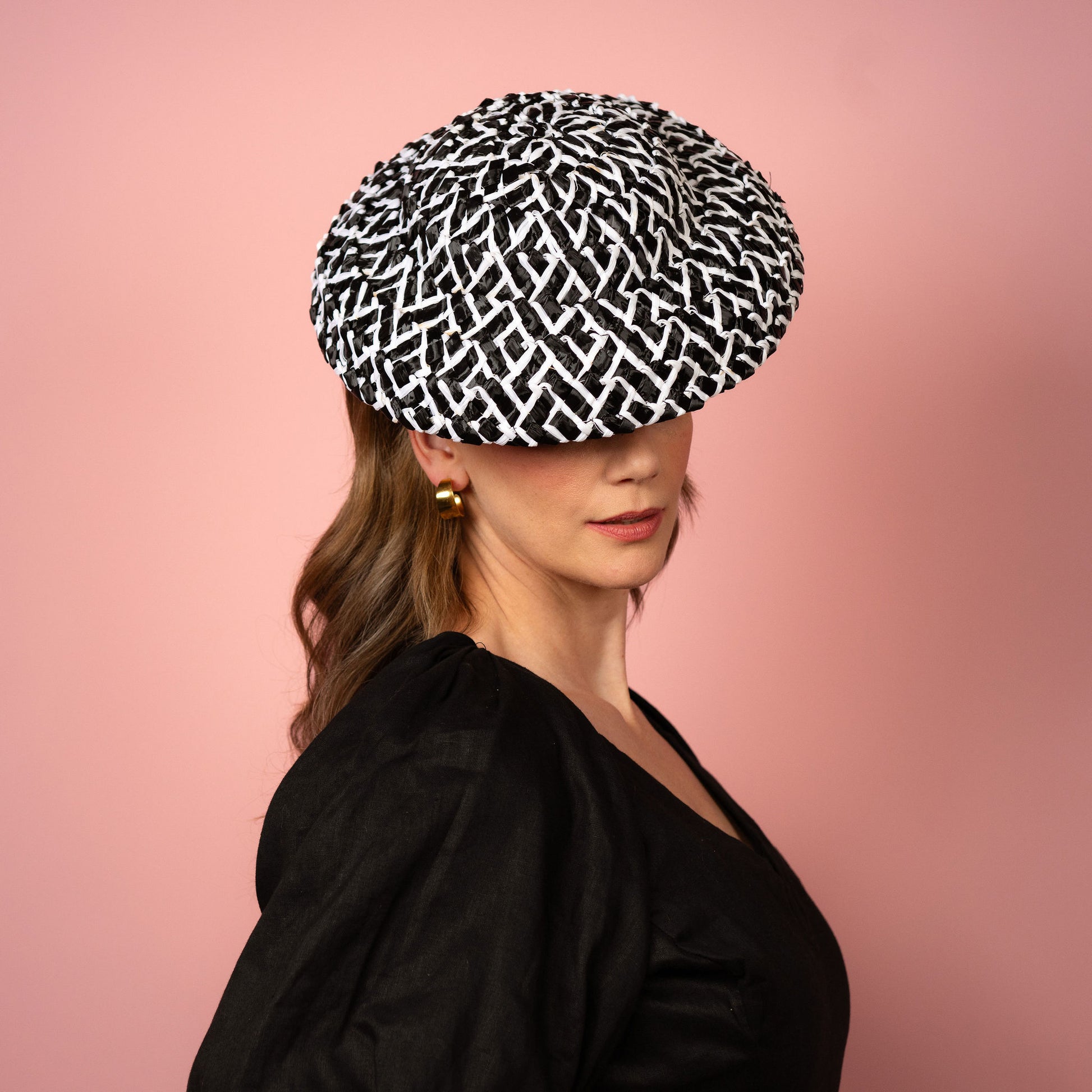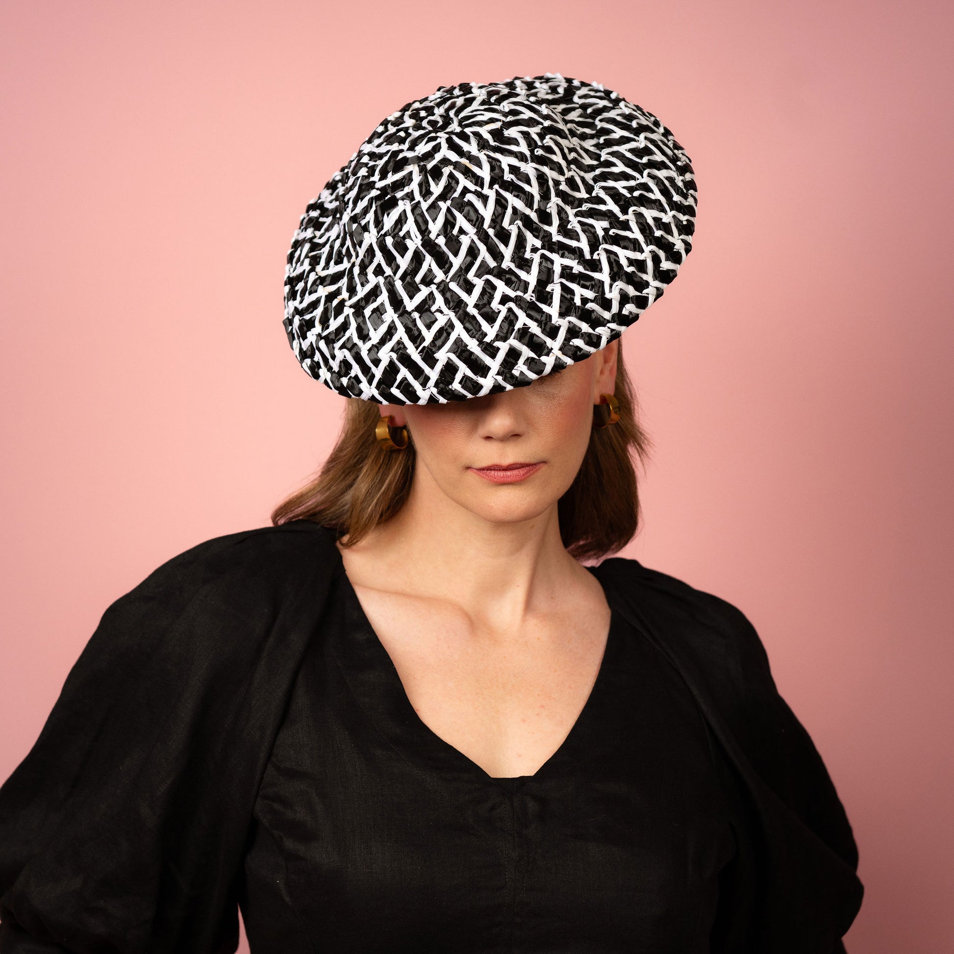 Fleur is a soft shaped brim headpiece in black and white vintage straw.