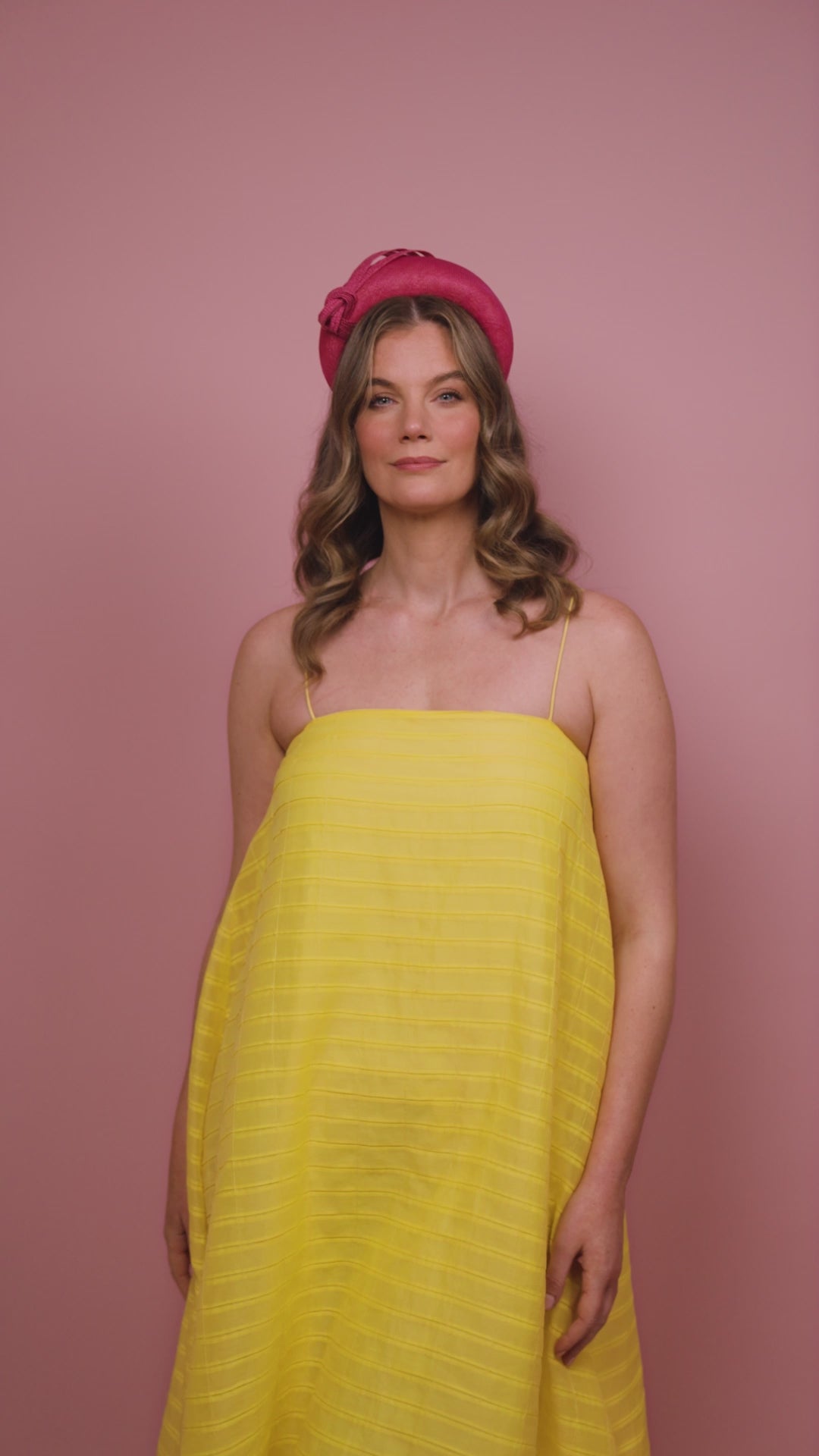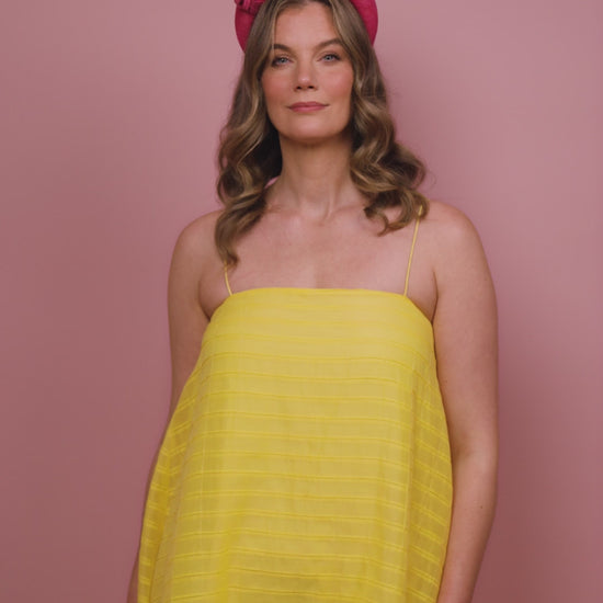 The Florence headband is a classic blocked shape made from a stunning textured straw cloth with a strong but simple knot trim in a vibrant pink. This shape is a one size fits all and is secured to the head with an elastic and comb.
