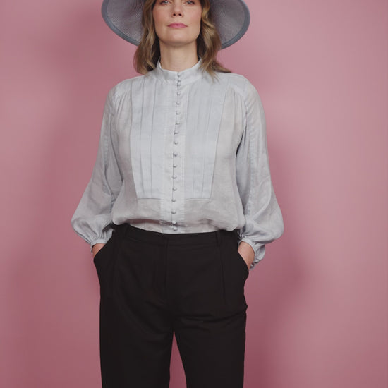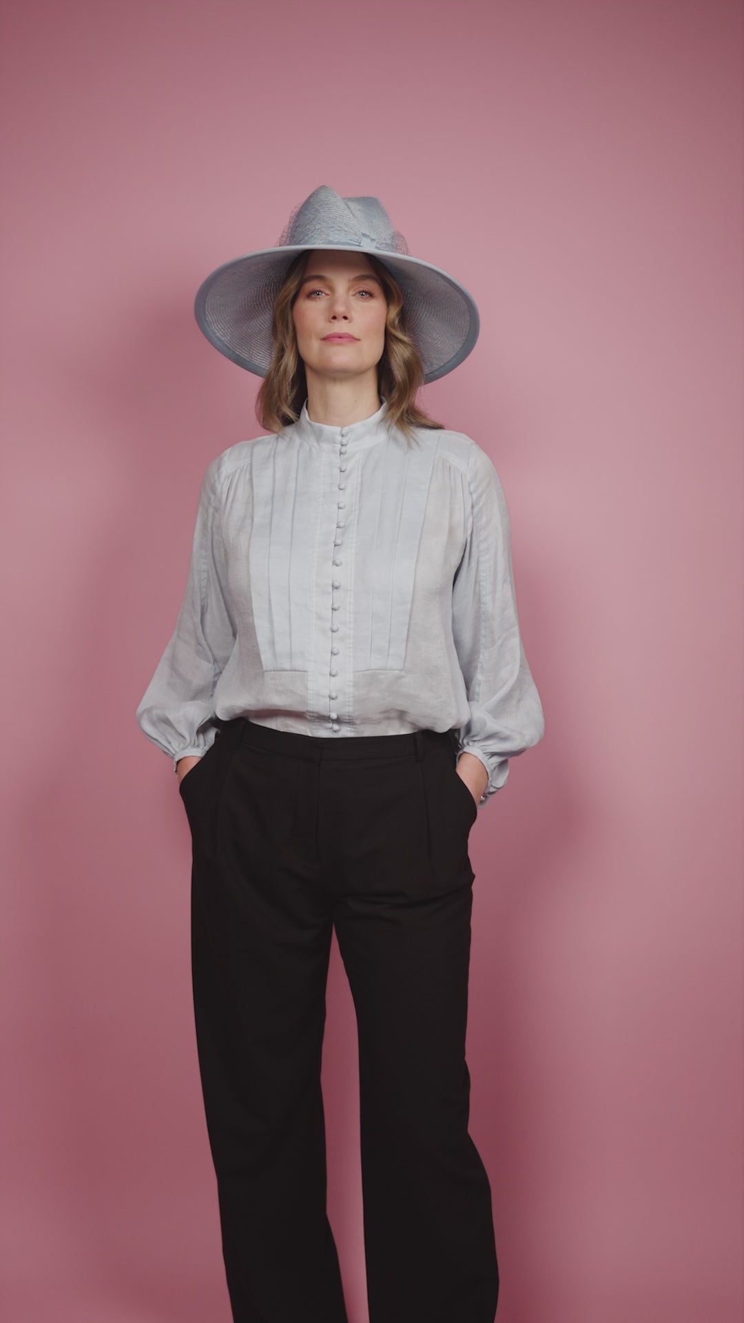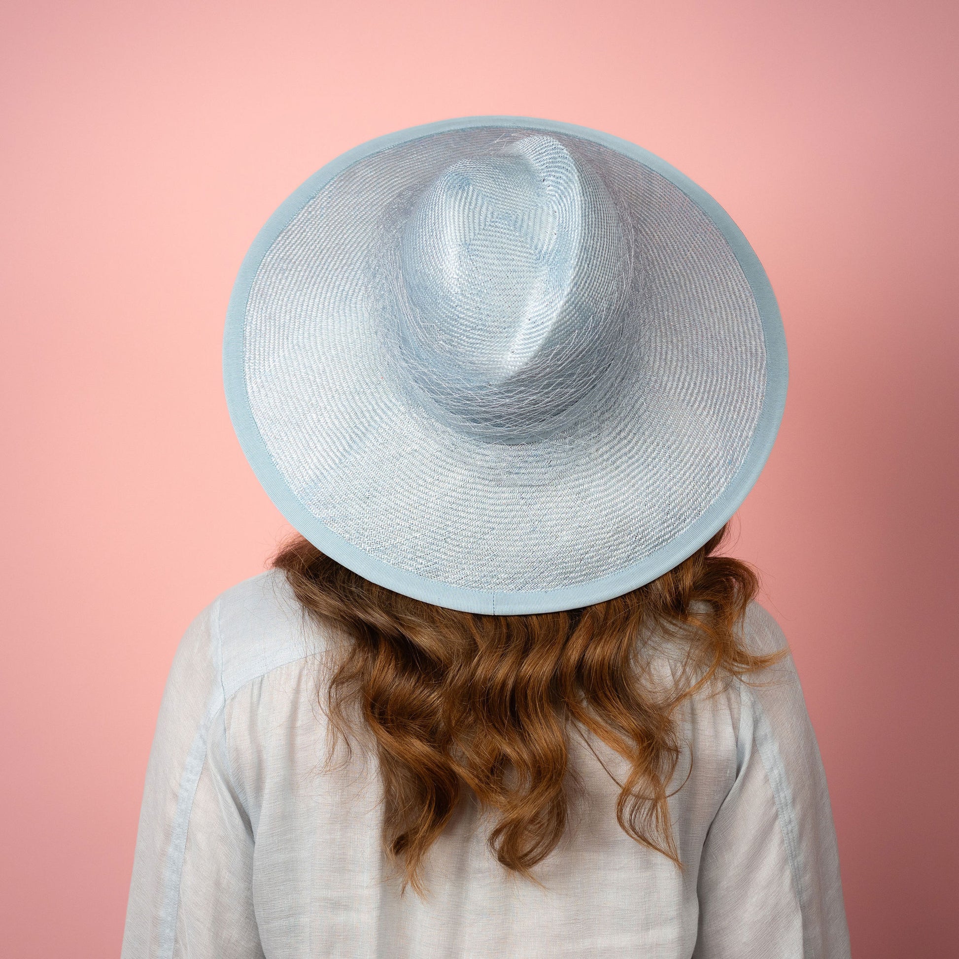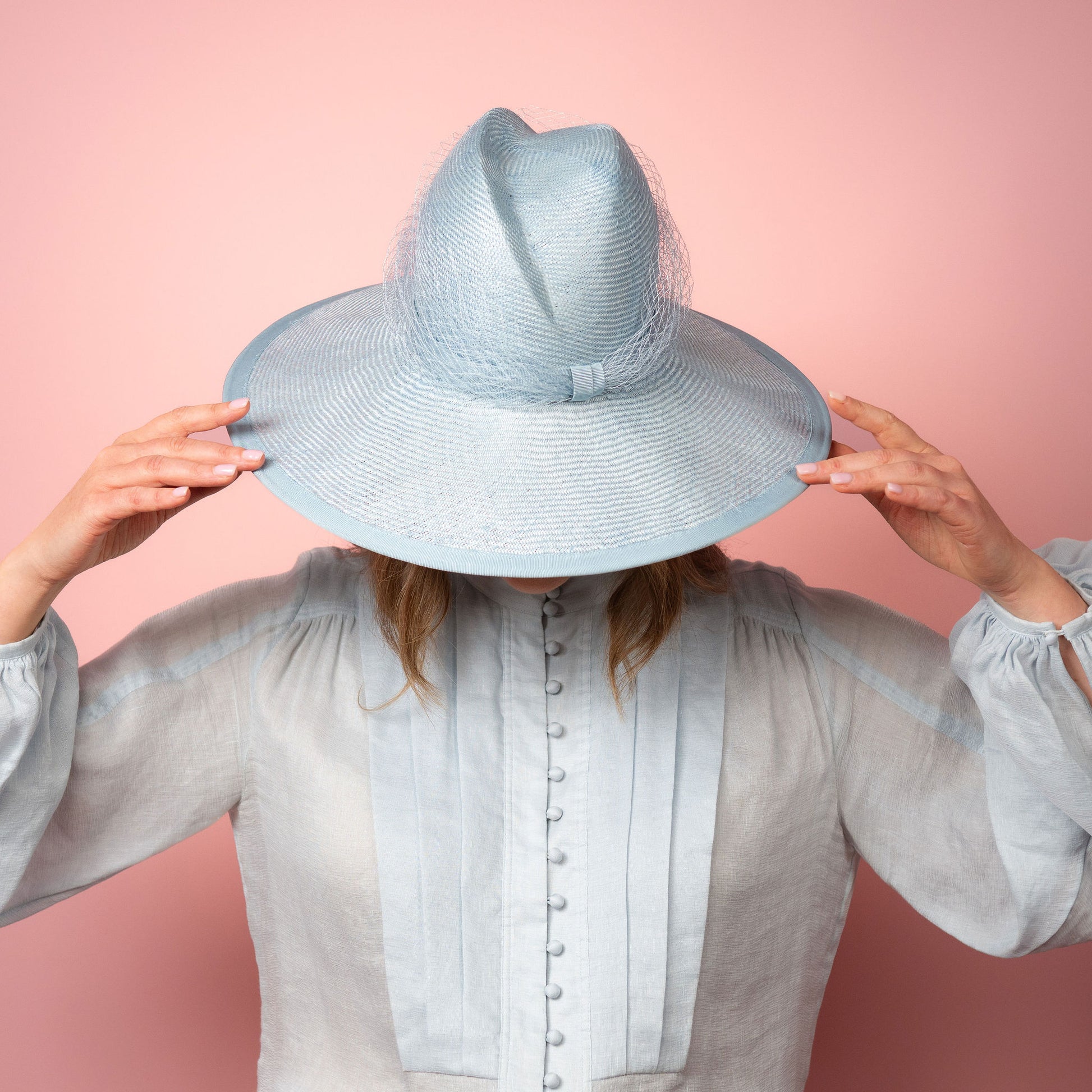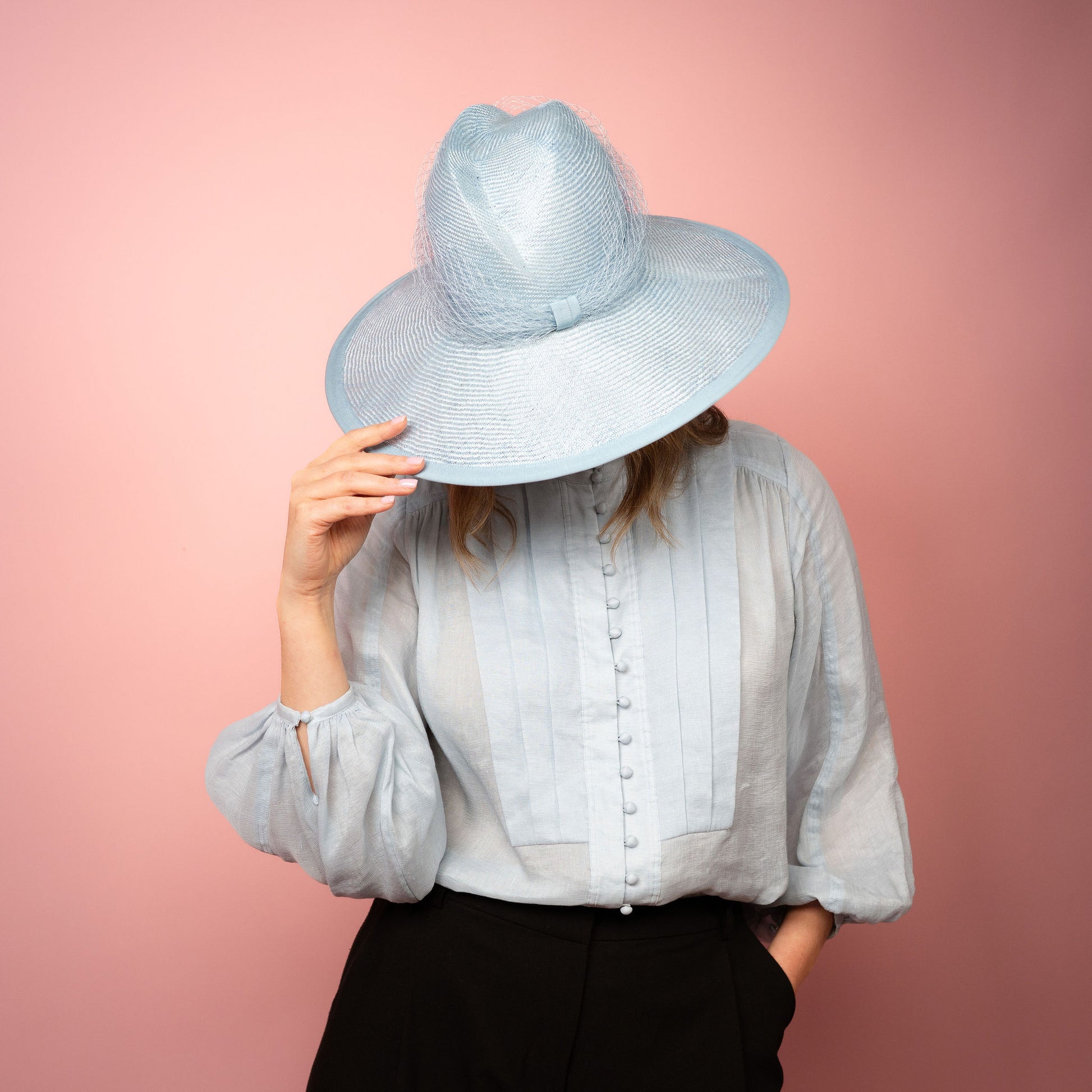 Isabella is a wide-brimmed hat with a shaped crown in pale blue with veiling. This piece is made for a 57cm head fit and is secured in place with a elastic and comb.