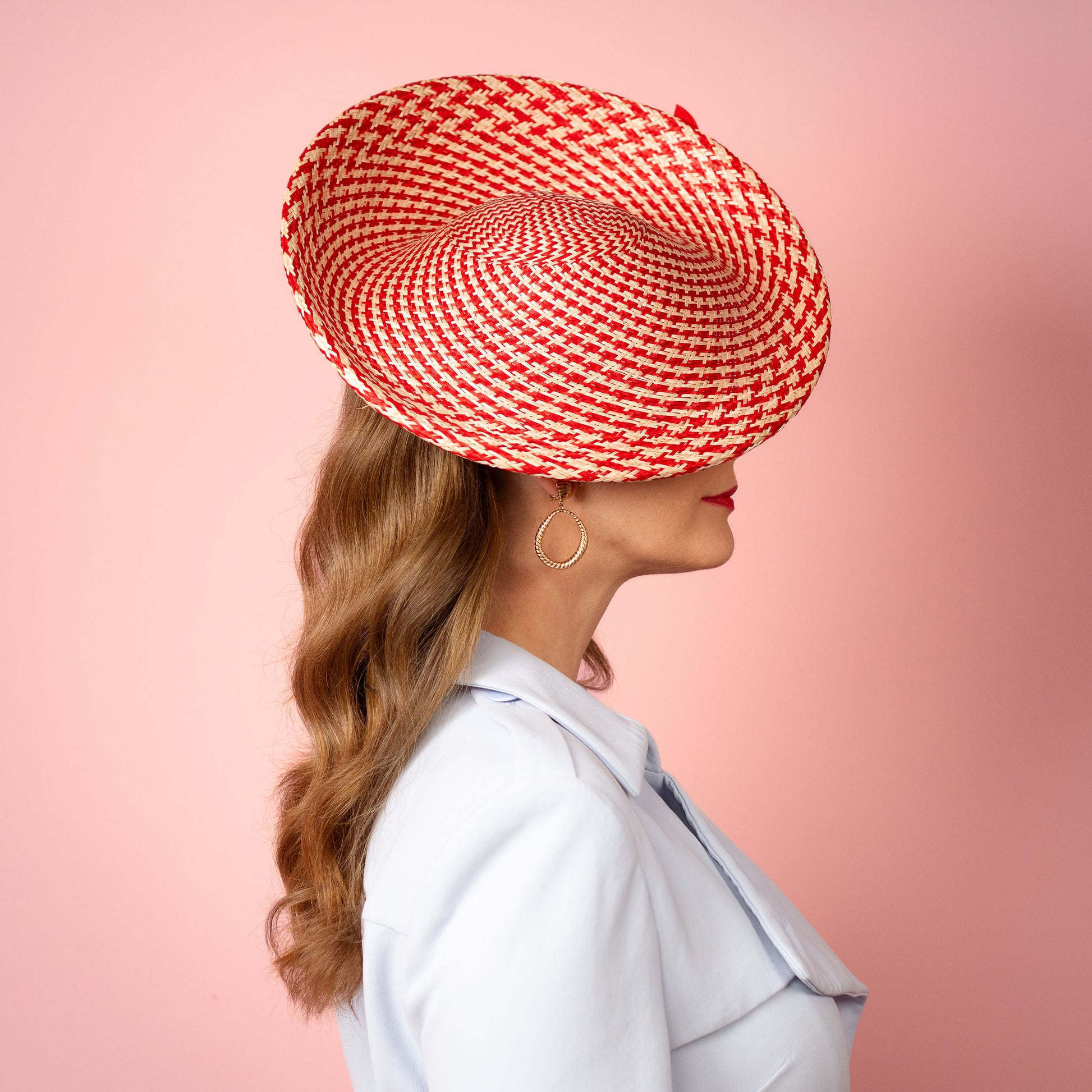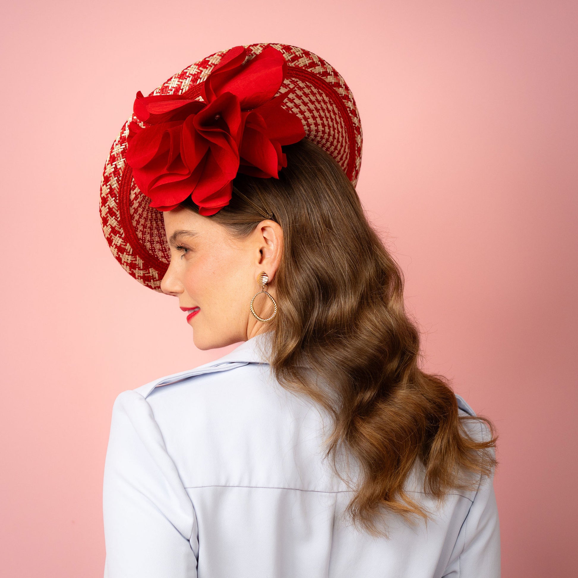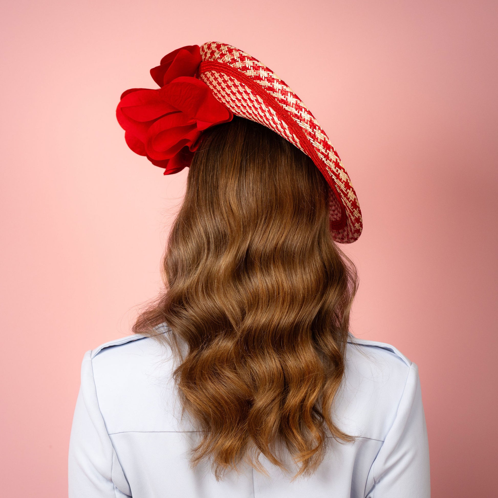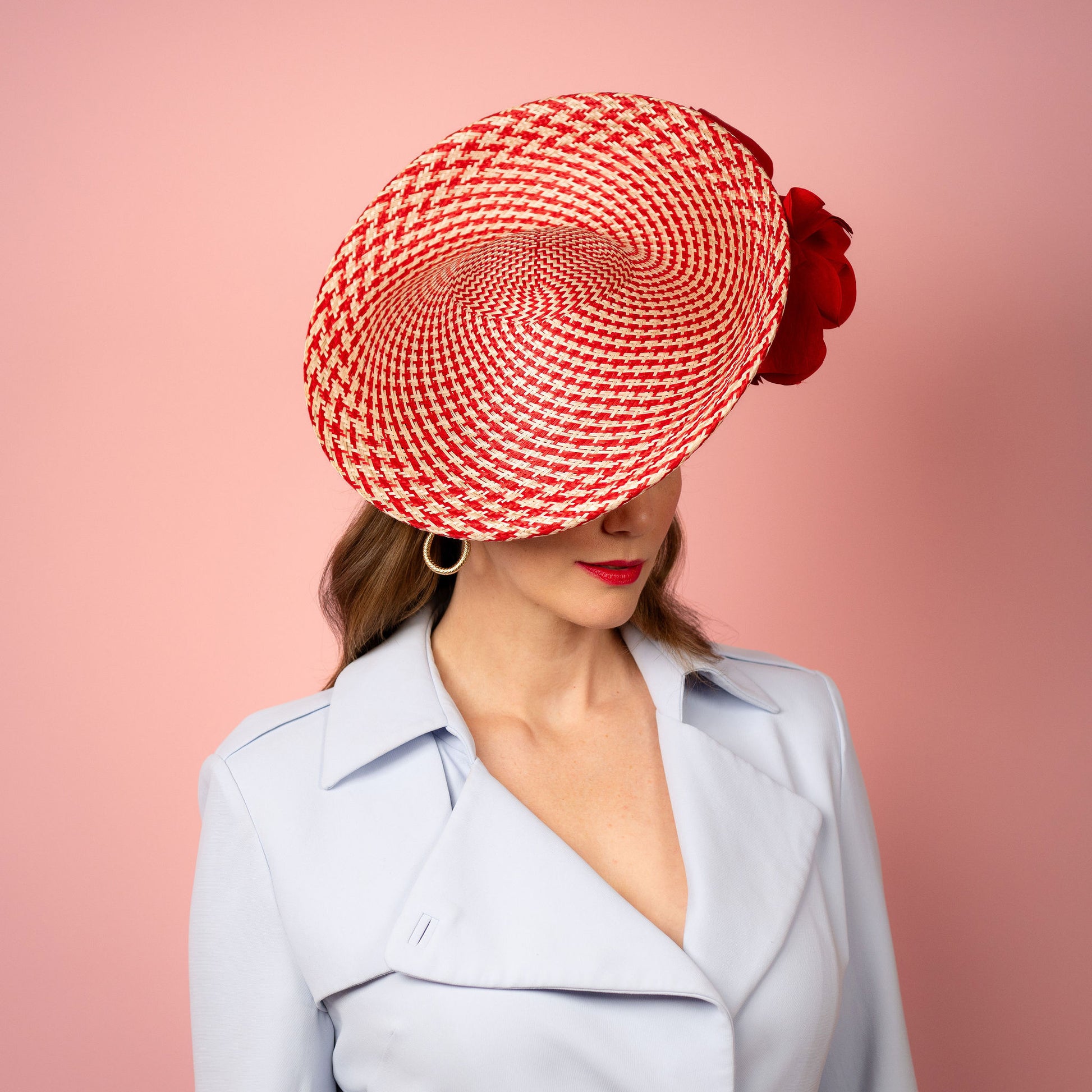 Monique Saucer in Textured Straw Silk Poppy Flower Trim in Red and White Spring Racewear Headpiece