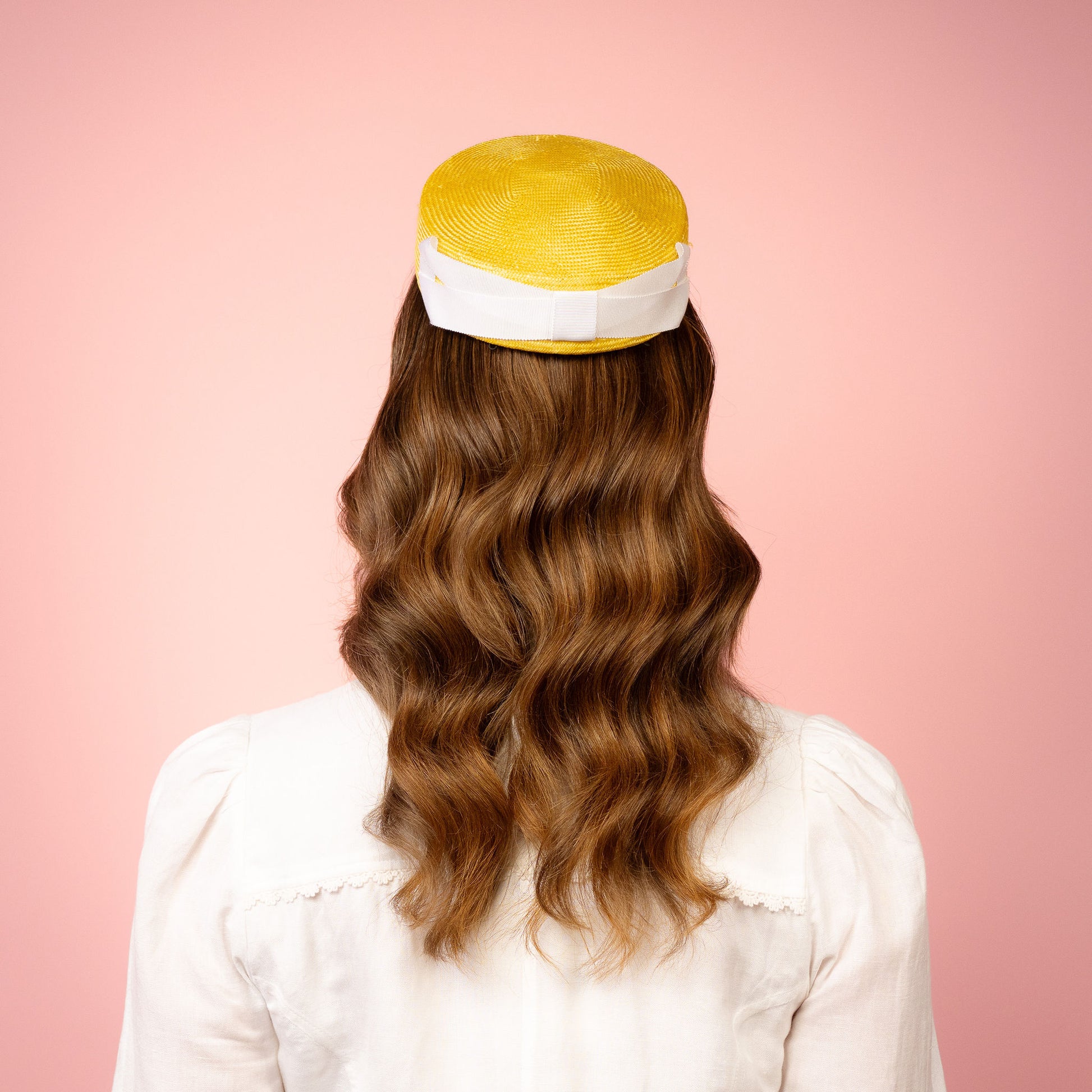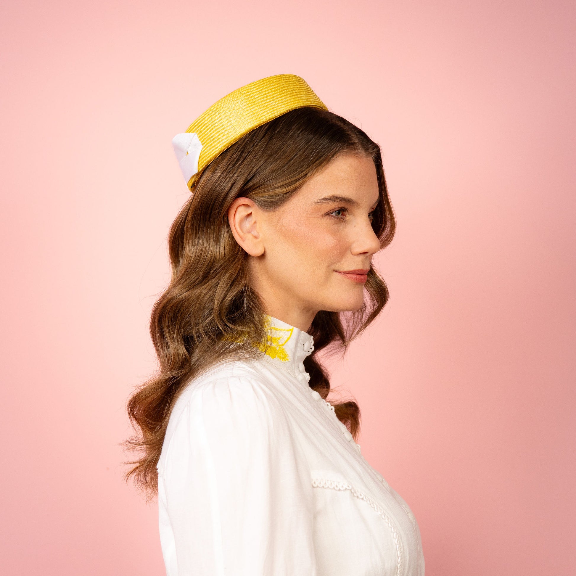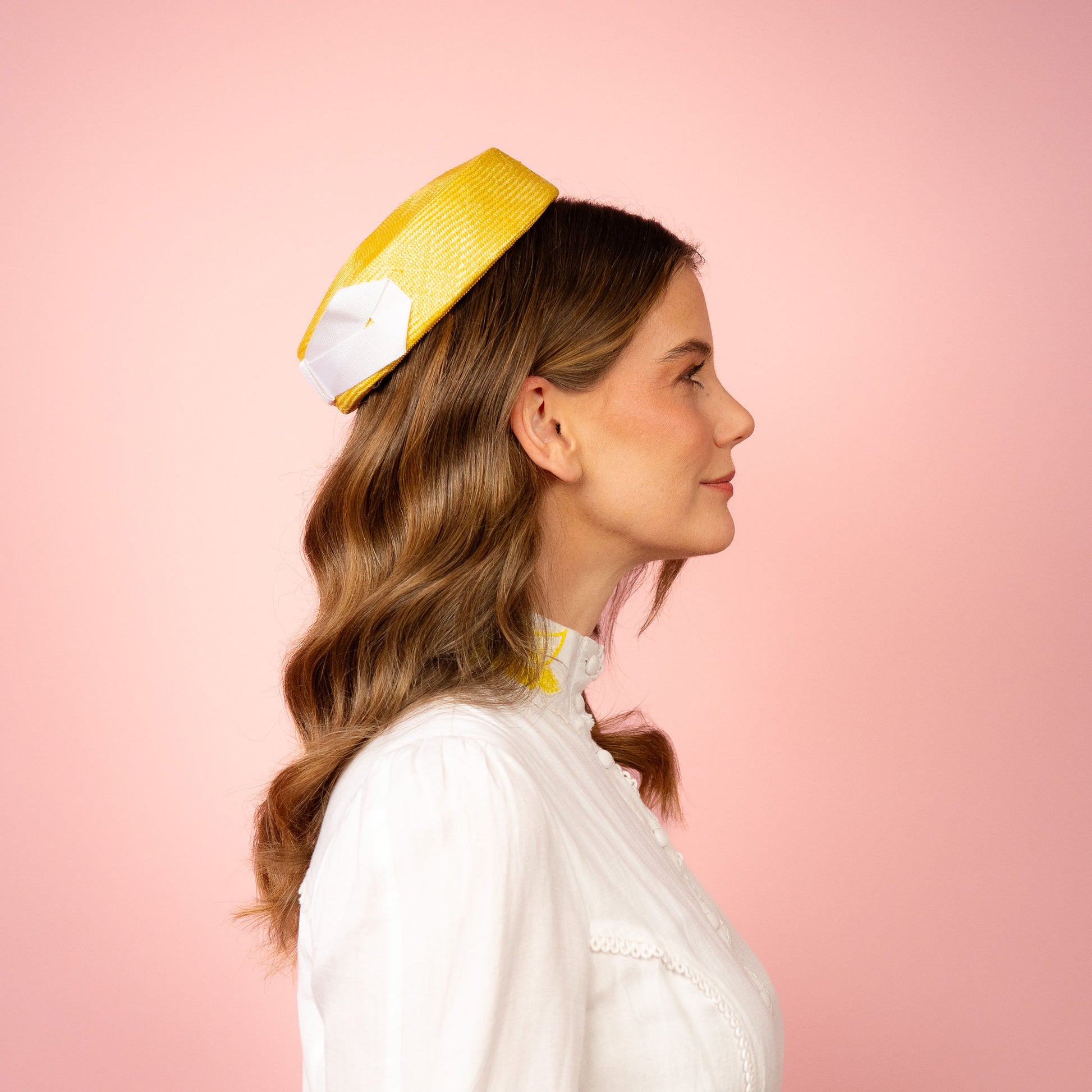 Peggy Pillbox in yellow straw with white petersham infinity bow Spring Racing Headpiece