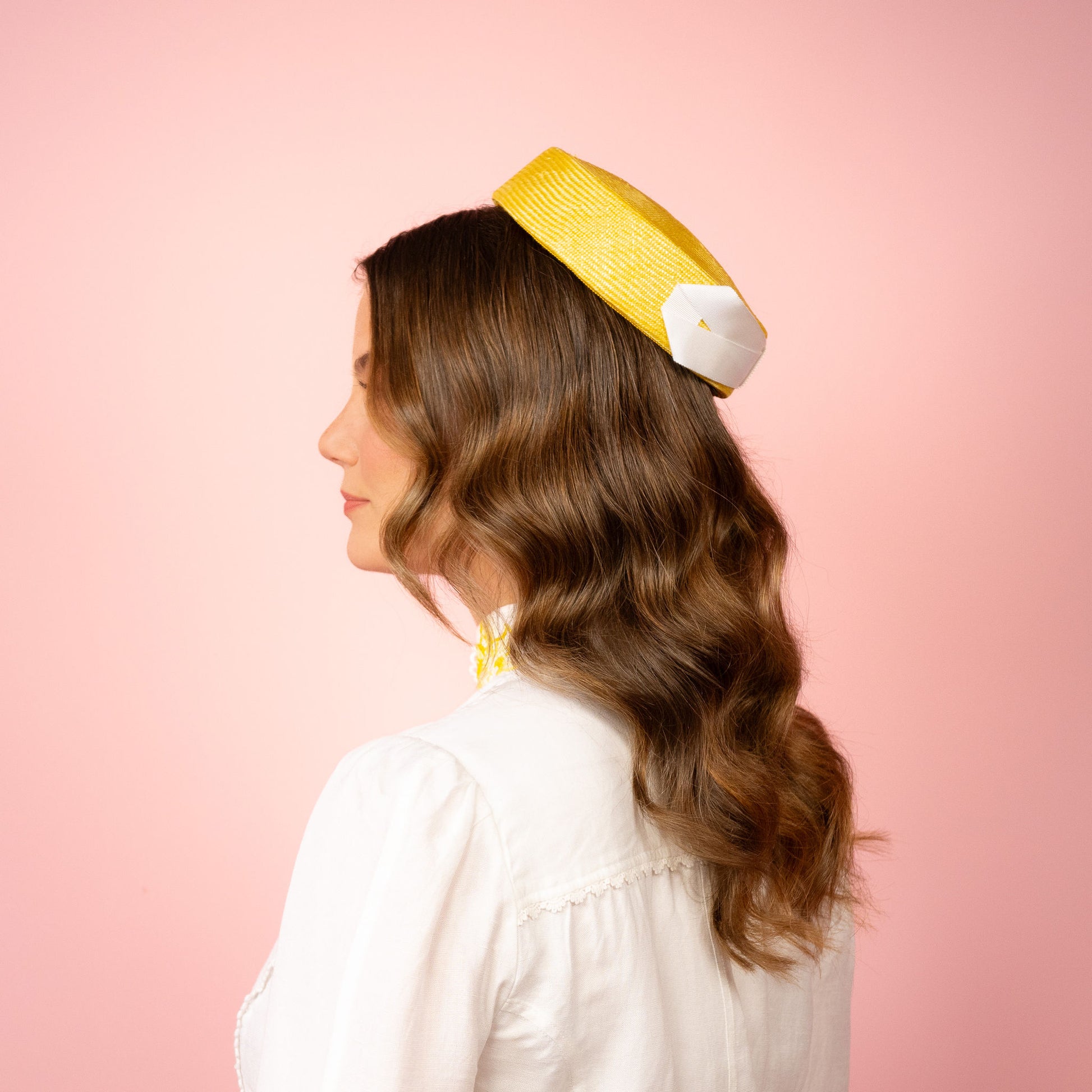 Peggy is a pillbox in yellow straw with white petersham infinity bow. This piece is secured with comb and elastic loops .
