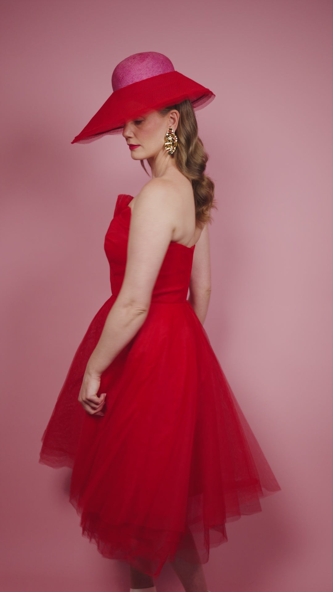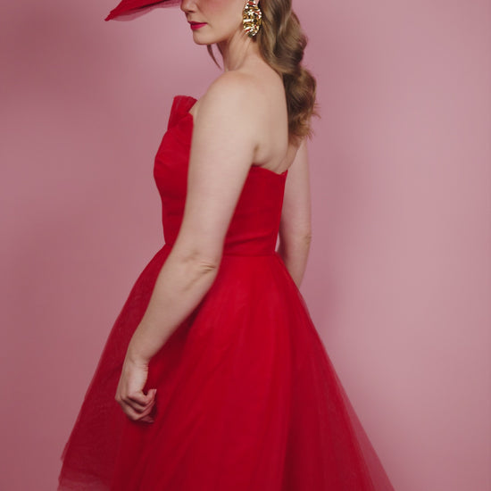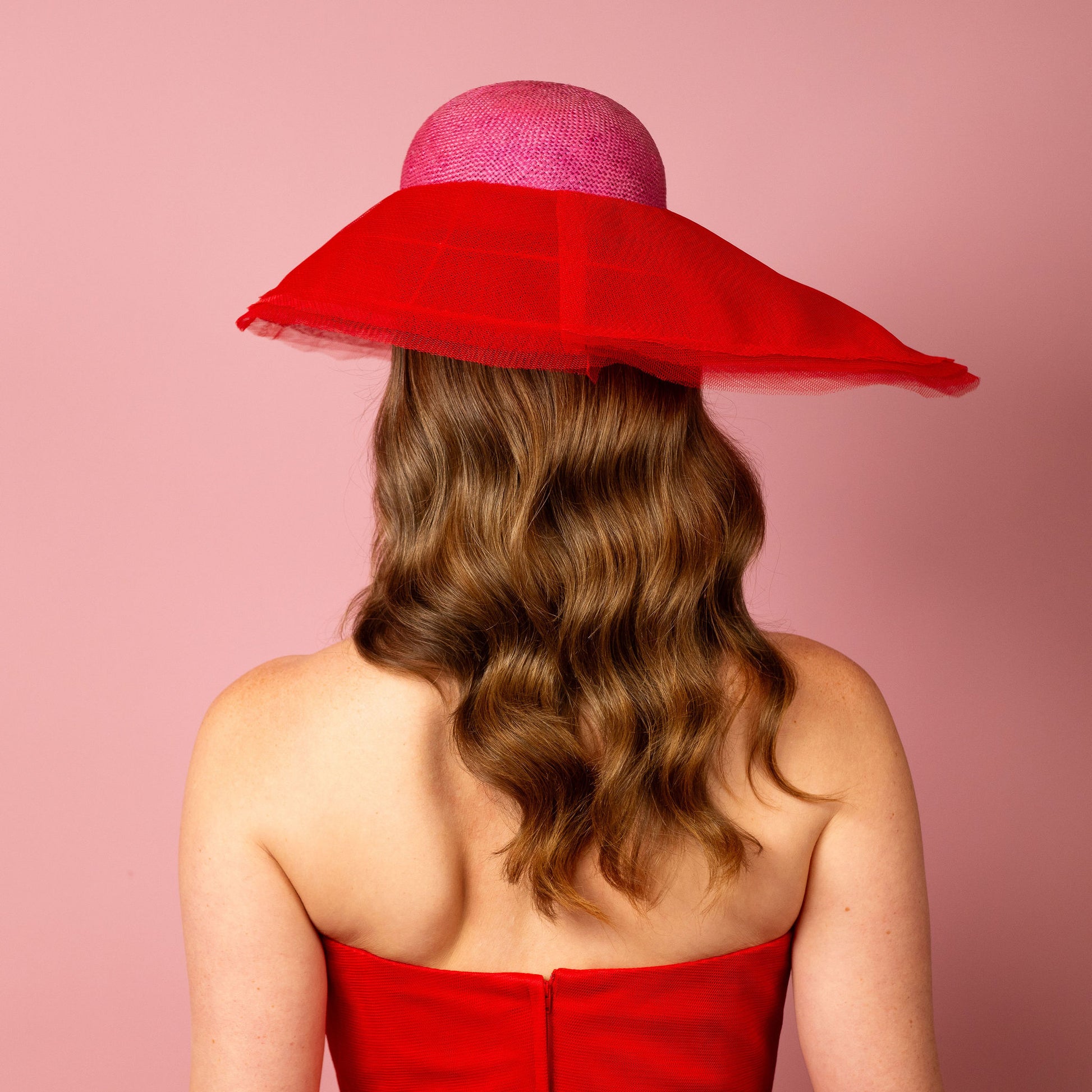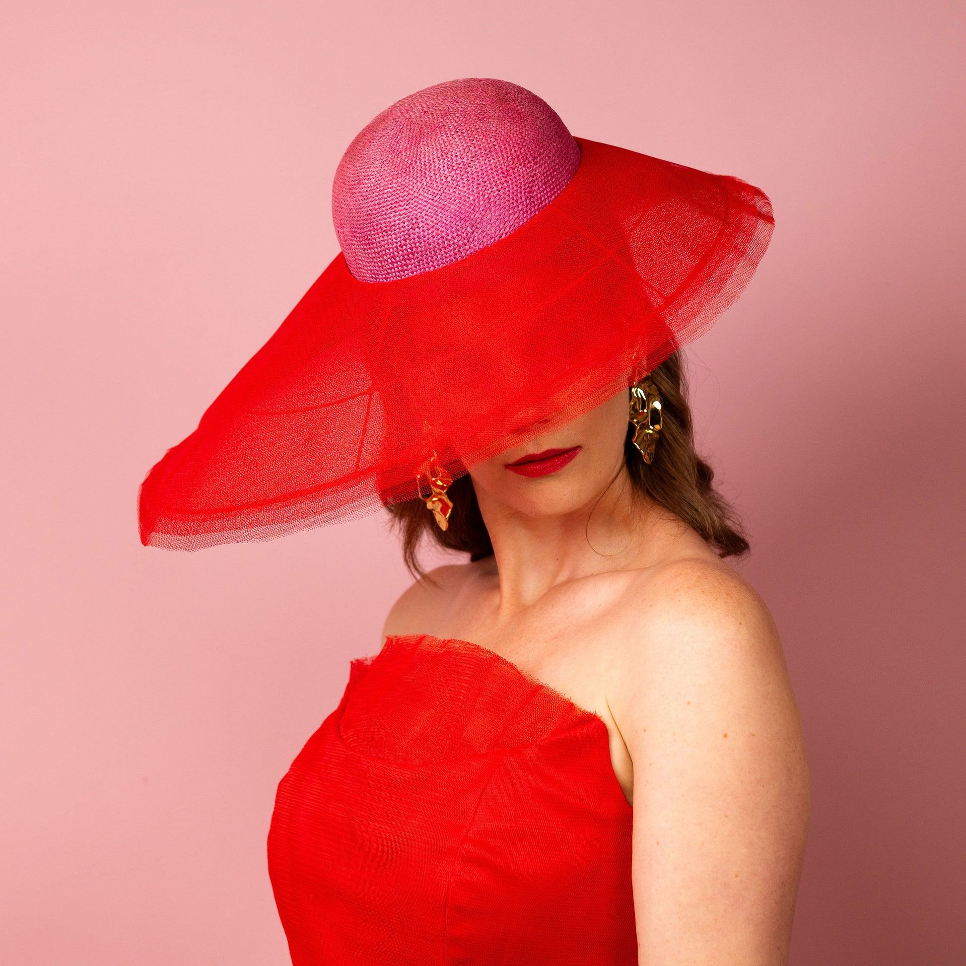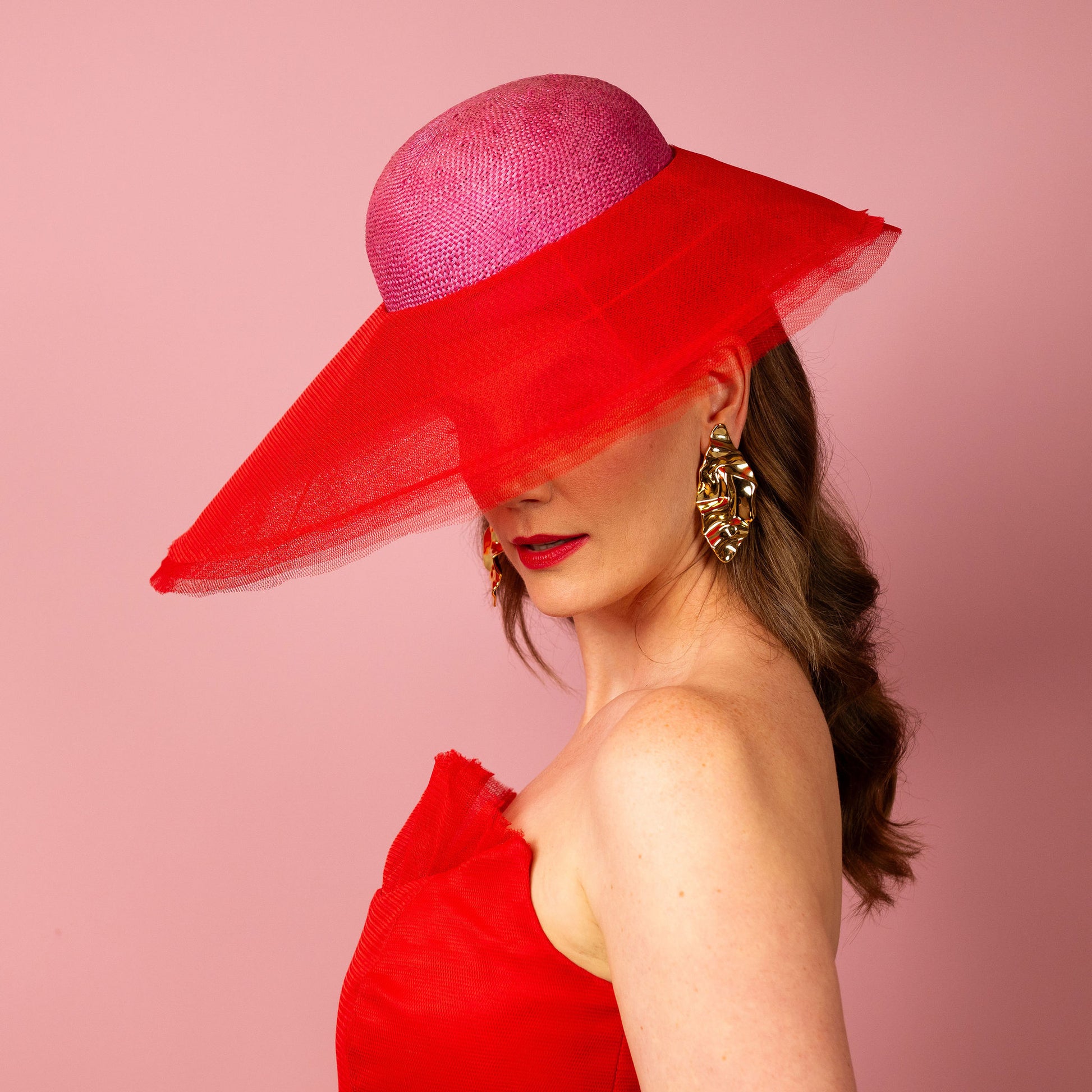 Adeline is a chic, rounded, straw crown in pink with a layered red tulle asymmetrical brim. It is designed to be worn over the right eye and secured with an elastic and comb.